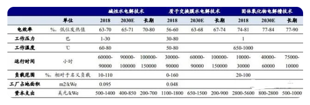 电解水即通过电解将水分解为氢气与氧气的过程。目前较为常见的电解水技术主要包括:碱性水电解技术、质子交换膜(PEM)水电解技术以及固体氧化物电解槽技术(SOECs)三种。其中碱性水电解技术是最为成熟且已实现商业化应用的技术,发展至今已有近100年历程,本质上氯碱工业使用的就是该技术,相较其他技术成本较低;PEM技术则较为先进,可有效解决电解液回收与循环利用的问题,体积较小且操控灵活,更适用于人口密集的城市地区以及分布式使用,是目前最有发展前景的电解水工艺,但由于催化剂及膜材料昂贵成本较高,大范围推广应用仍依赖于技术进步与成本下降;SOECs技术使用陶瓷作为电解质,在高温下对蒸汽进行电解,目前技术尚不成熟,高温热源需求也限制了其经济性,尚处于研发阶段。