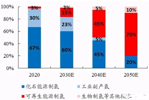 清洁能源快速发展,电解水制氢迎来曙光。除成本问题以外,利用传统网电制氢还存在严重的全周期内高碳排放的问题。由于国内电力供应七成为火电,若直接采用网电制氢,单位氢气碳排放量可达35.84kg,是煤制氢的近两倍,天然气制氢的3倍以上。而近年来清洁能源的快速发展为电解水制氢创造了良机:一方面,可再生能源发电制氢可实现全周期内的零碳排放,实现真正的绿氢生产;另一方面,随着风电、光电等成本下降以及平价上网,制氢成本也将持续下降。同时,利用弃风、弃光、弃水电力制氢可大大提升清洁能源的利用效率,有效解决跨时间、跨空间的过剩能源消纳问题。从政策方面来看,国家发改委、国家能源局先后发文支持高效利用廉价且丰富的可再生能源制氢,国务院印发《新能源汽车产业发展规划(2021-2035年)》和五部门《关于推动燃料电池汽车示范应用的通知》均明确支出鼓励发展绿氢,进一步支持有条件的地区通过发展低碳清洁氢气支取率先达峰,探索“制氢电价”等刺激政策。在“3060碳达峰碳中和”政策背景下,风光电等清洁能源装机量将持续高速增长,绿氢或迎来快速发展期。根据中国氢能联盟预测,到2050年可再生能源电解制氢占比将达到70%。