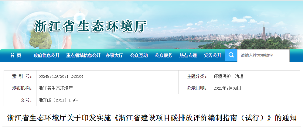 浙江省生态环境厅关于印发实施《浙江省建设项目碳排放评价编制指南(试行)》的通知