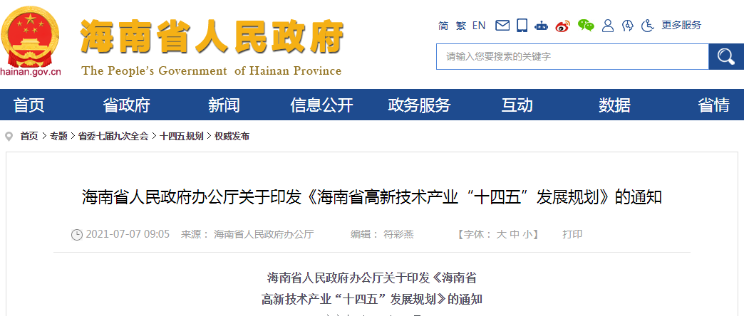 2021年7月7日,海南省人民政府发布《海南省高新技术产业“十四五”发展规划》的通知。该规划是根据《海南自由贸易港建设总体方案》《海南省国民经济和社会发展第十四个五年规划和二0三五年远景目标纲要》制定。规划期限为2021年至2025年。、