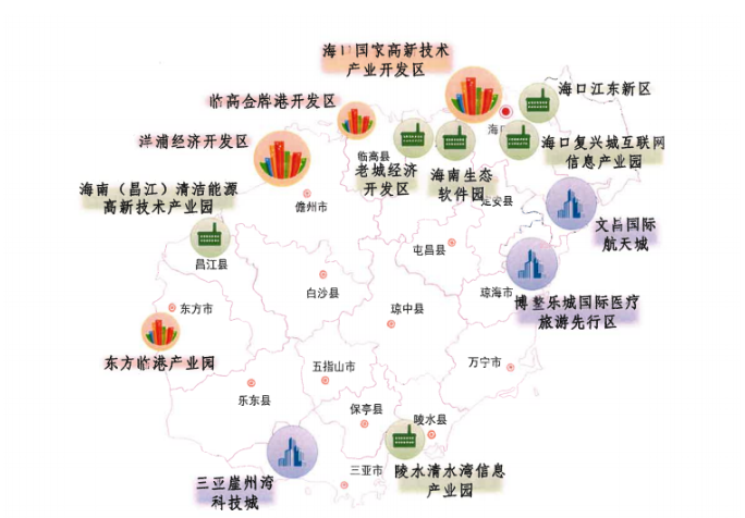 并结合海南各市县产业基础、区位条件和市场环境,着力构筑 “两区、三城、六园”的产业空间格局。