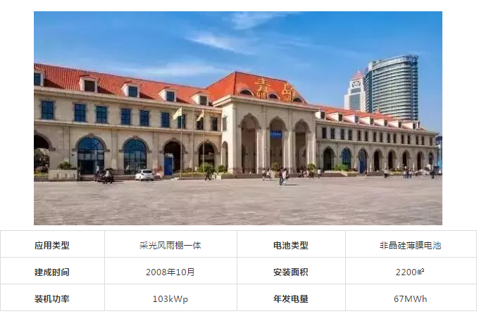 在青岛站改造的整体要求下,一体化的设计、建筑风格的统一、安全与功能性有机结合成为这座光电建筑的重要突破点。集采光、遮阳、挡风雨和发电于一体,组件尺寸与建筑分格一致,透光线条统一,内侧银色与室内装饰效果能很好的结合,并能衬托室内简洁典雅的风格,达到装饰与结构完美结合。青岛站的这套光伏系统规模不算大,但它开创了我国光伏系统与大型公共复古建筑完美结合的先河。