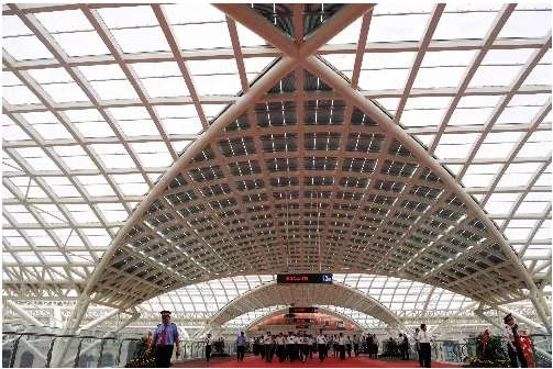 其雨棚用电采用“光伏”发电系统,雨棚上的灯可根据人流及天气情况自动明灭。人文的设计和环保的理念使成为欧亚大陆桥上的又一颗明珠。