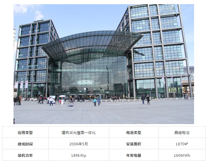 中央车站采用了大量的新技术,光电屋面是所有技术中的一个亮点,同时也是当时非常具有代表性和示范意义的光电建筑之一。在450米长东西走向的站台拱形玻璃屋顶上集成安装了大约1870平方米的太阳能发电光伏组件。这些光电板集成在屋面玻璃系统中,并在西屋顶的172米和东屋顶的107米之间沿地平线的7°~19°玻璃屋面上安装。