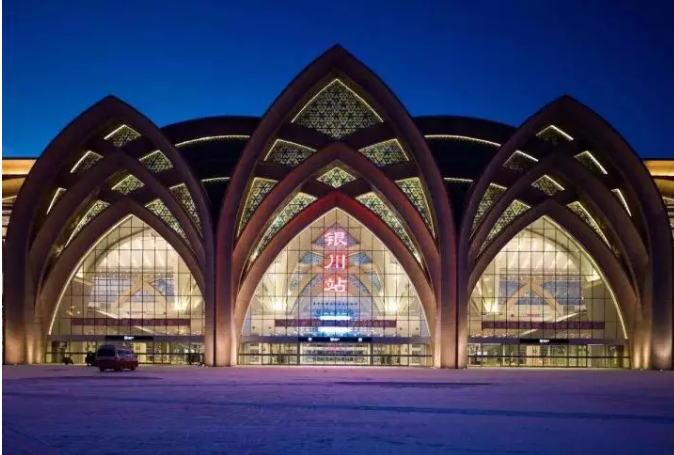 银川站设计融入和体现了“人文绿色理念”:钢桁架为旅客创造出通透宽畅的无柱空间,伊斯兰风格的顶部展现出浓郁的民族风情。