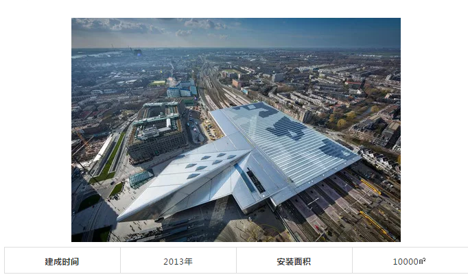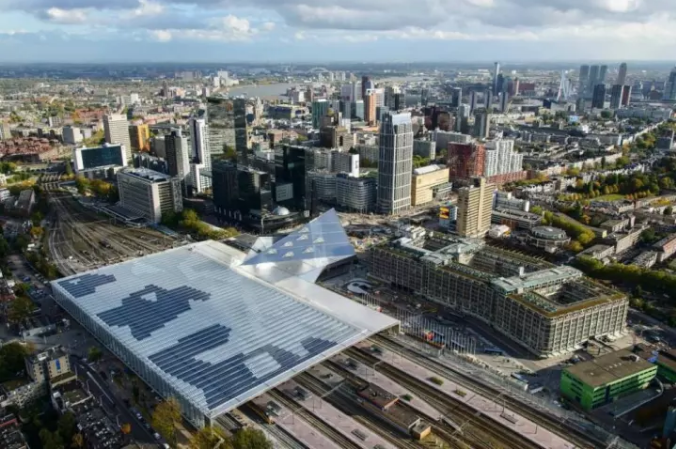 鹿特丹中央火车站屋顶面积达28000平方米,130000块装置有太阳能电池板的玻璃覆盖了其中的10000平方米。这是在荷兰最大的车站屋顶太阳能应用项目,也是欧洲最大的屋顶太阳能项目之一。
