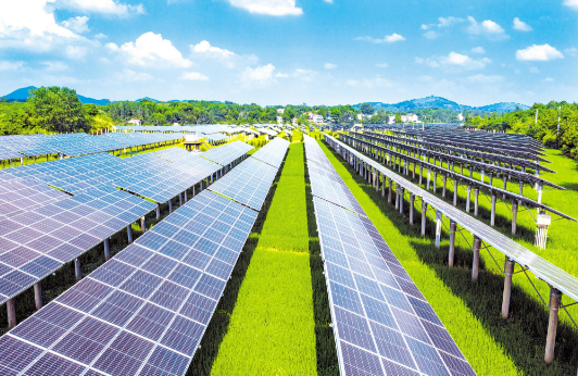 7月14日,浠水县团陂镇毛畈村的太阳能光伏面板下,水稻绿意盎然。这是毛畈村的100兆瓦大型农光互补地面电站。项目由中清能绿洲科技股份有限公司投建,总投资5.8亿元,年发电量1.1亿千瓦时。据了解,虽然光照略有影响,产量降低,但优质稻亩产不会低于450公斤。上方光伏板发电,光伏板下种植水稻,一地两用。电站投产后每年能为镇上带来1000万元税收,为村集体年增收10万元。
