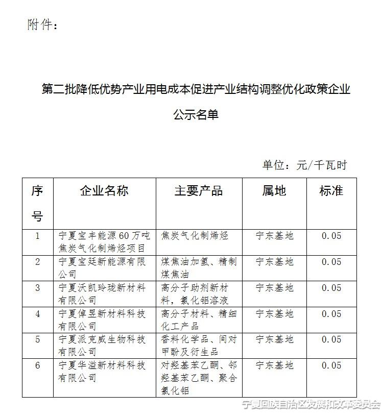 宁夏自治区发展改革委公布关于第二批享受降低优势产业用电成本促进产业结构调整优化政策企业名单,原文如下: