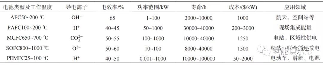 下表对比了各种类型燃料电池技术,可以看出不同燃料电池的特性有差异,适用范围也不尽相同,因此对于不同电池类型及其相关特性,有着不同的应用场景。