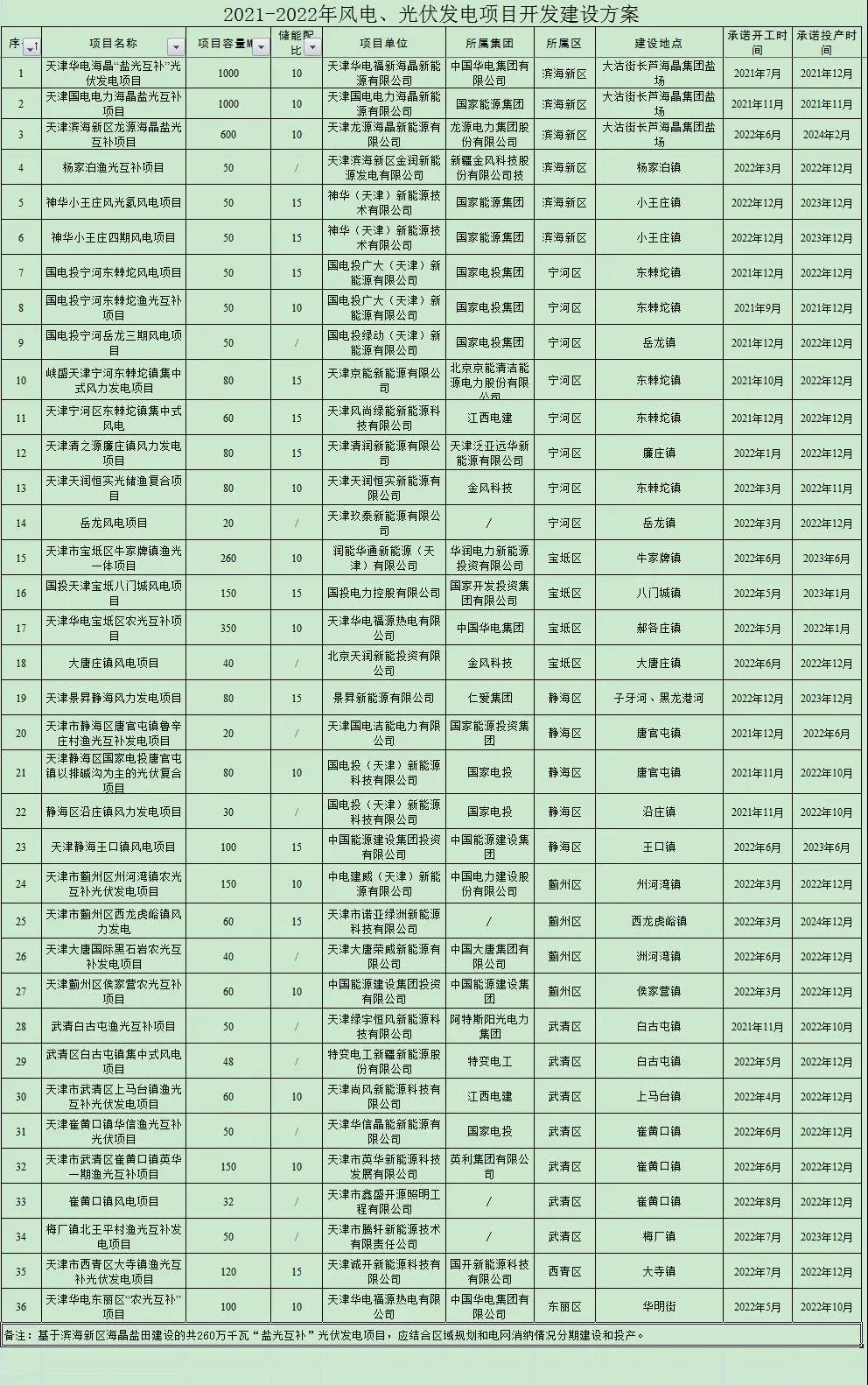 共计36个!天津市2021-2022年风电、光伏发电项目开发建设方案出炉