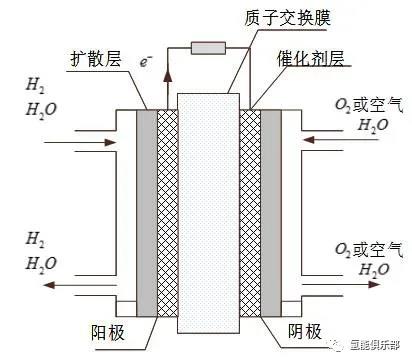PEMFC燃料电池是当前在氢能应用领域的研发重点之一。其工作原理为氢气与氧气(或空气)发生电化学反应生成水并释放出电能,即电解水的逆反应。PEMFC燃料电池的结构与工作原理如下图,当阳极和阴极分别供给氢气和氧气(或空气)时,在催化剂的作用下,氢气在阳极上被氧化离解成电子和氢原子。氧气在阳极上被还原接受电子反应生成水。与此同时,电子在外电路的连接下形成电流,向外部释放电能。