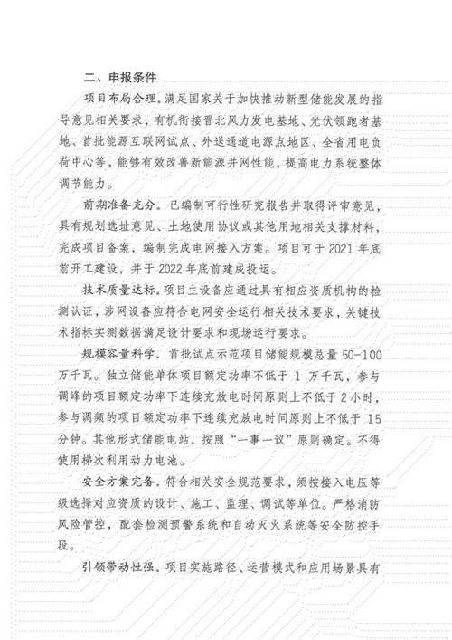 山西省要求,首批试点示范项目储能规模总量50-100万千瓦。其中,独立储能单体项目额定功率不低于1万千瓦,参与调峰的项目额定功率下连续充放电时间原则上不低于2小时,参与调频的项目额定功率下连续充放电时间原则上不低于15分钟。其他形式储能电站,按照“一事一议”原则确定。不得使用梯次利用动力电池。