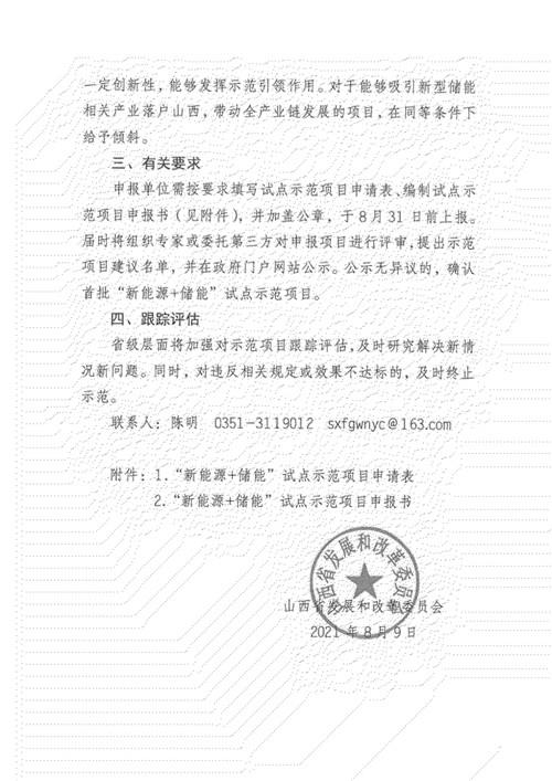 8月9日 ,山西省发改委发布《关于组织首批“新能源+储能"试点示范项目申报的通知》,要求项目资料于8月31日前上报。