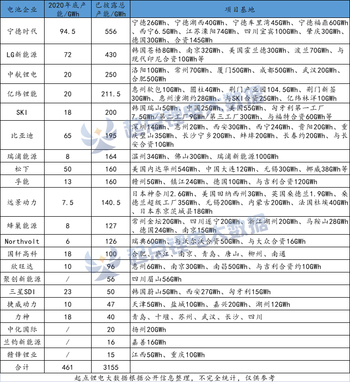在高需求驱动下,海内外动力电池企业均在大力扩产,新一轮产能扩建军备赛打响。据起点锂电大数据不完全统计,目前包括宁德时代、LG新能源、中航锂电、亿纬锂能、SKI、比亚迪等21家企业规划产能已达到3155GWh。