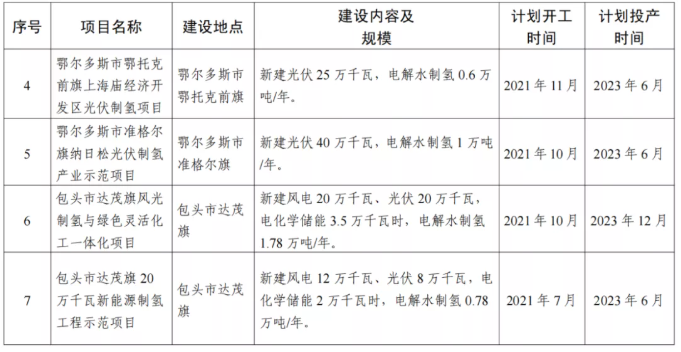 从氢能需求、新能源规模配置、制氢方案、氢能利用等方面,优选了示范项目7个,其中鄂尔多斯市5个、包头市2个。示范项目建设新能源221.95万千瓦,其中风电36.95万千瓦、光伏185万千瓦,电解水制氢6.69万吨/年。