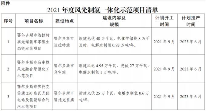 近日,内蒙古自治区能源局发布了关于开展2021年度风光制氢一体化示范的通知,内蒙古自治区能源局表示,为了促进氢能产业发展,按照重点地区先行先试有关要求,组织评估并优选了2021年度风光制氢示范项目。