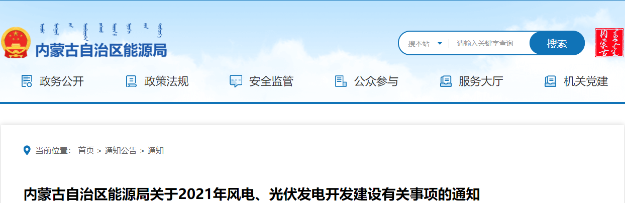 为坚决贯彻落实党中央关于碳达峰、碳中和的重大决策部署,推动自治区风电、光伏发电高质量发展,按照《国家能源局关于2021年风电、光伏发电开发建设有关事项的通知》(国能发新能〔2021〕25号)、《国家发展改革委、国家能源局关于鼓励可再生能源发电企业自建或购买调峰能力增加并网规模的通知》(发改运行〔2021〕1138号)的要求,结合自治区实际,内蒙古自治区能源局发布2021年全区风电、光伏发电开发建设有关事项通知。原文如下: