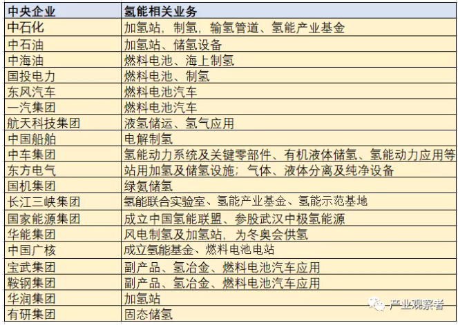 目前,中石化、中石油、国投电力、东风汽车、一汽集团、中航工业、中国船舶、中车集团、东方电气集团等中央企业都已经在氢能产业链上实施布局,主要业务包括制氢、储氢、加氢站、燃料电池及整车业务。