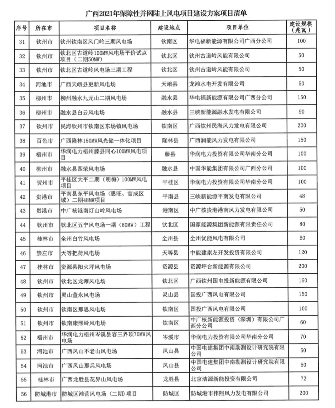 根据《通知》显示:列入2021年保障性并网陆上风电建设方案的项目共有56个,共计4814.5MW(4.8145GW);列入2021年保障性光伏发电项目建设方案的项目共有47个,共计4660MW(4.66GW)。