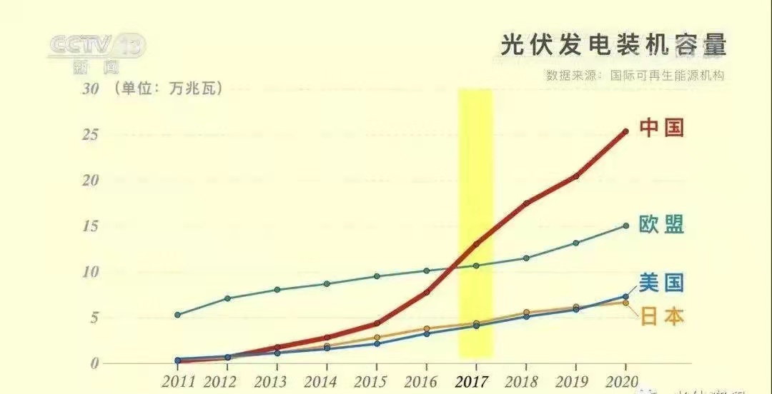 2011年,中国的装机容量仅为日本、美国的六成,为欧盟的6%。从2013年起,国家加大节能减排力度,光伏产业快速发展。到2017年,中国的装机容量就超过了整个欧盟的总和。