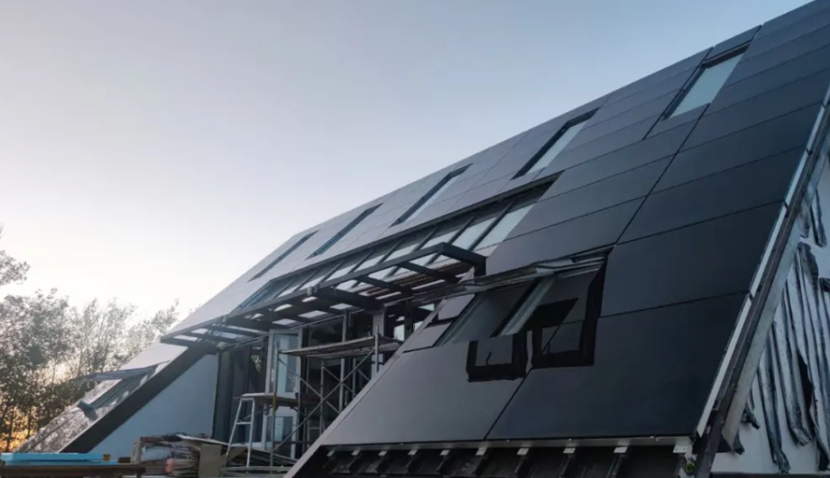 为了兼顾‘斜屋’整体美观度和建筑的电能需求,嘉盛光电为‘斜屋’提供了定制化的光伏建筑一体化(BIPV)解决方案。该方案包括嘉盛光电50块“琉璃·玄青”光伏建材产品,总装机15.67kW,采用隐框式方式与“斜屋”坡面高度集成,不仅外观上与‘斜屋’造型协调一致,更有优秀的发电表现,配合着锂电储能系统,可为“斜屋”全天候运行提供电力供应。
