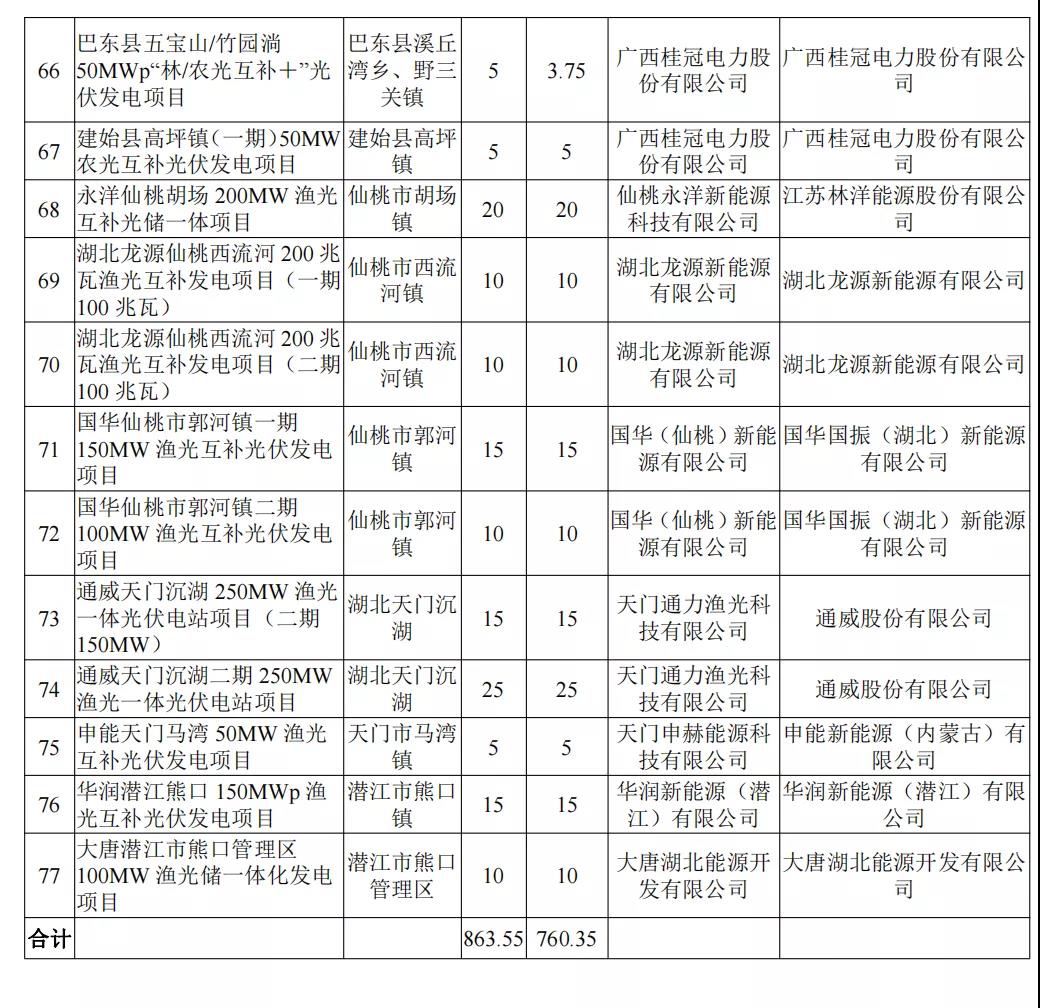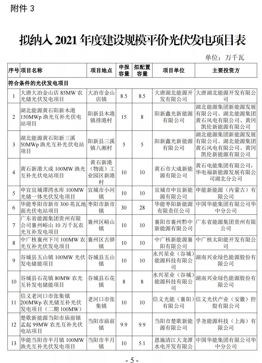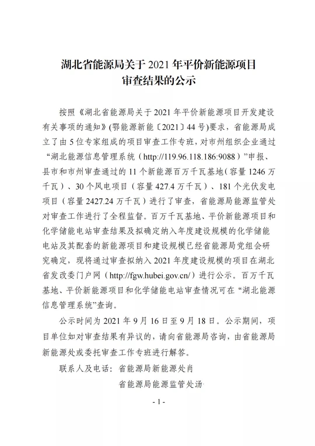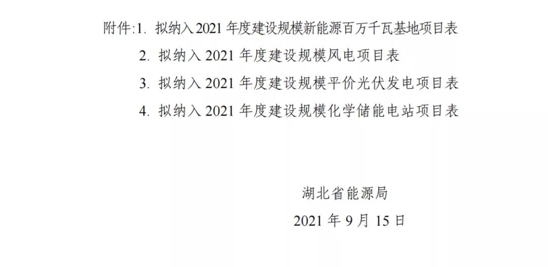 9月15日,湖北省能源局发布《关于2021年平价新能源项目审查结果的公示》。