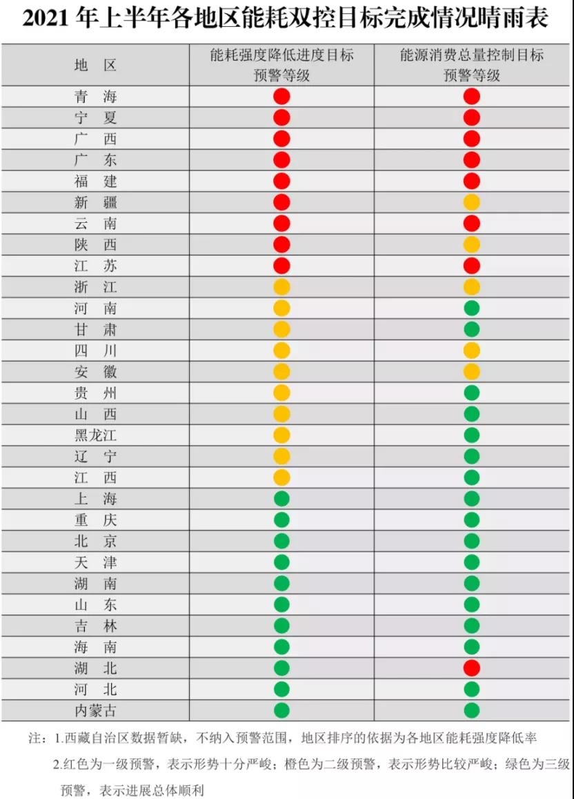 这源于日前国家发改委下发的2021年上半年各地区能耗双控目标完成情况晴雨表,广东、福建、云南、江苏、浙江、安徽、四川等12个地区在能耗降低和能源消费总量方面均呈现严峻态势,这意味着有一半以上的省份上半年“双控”目标未能完成。