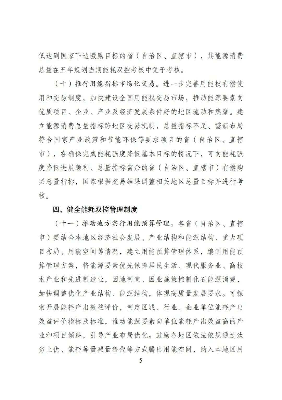同时,根据各省(自治区、直辖市)可再生能源电力消纳和绿色电力证书交易等情况,对超额完成激励性可再生能源电力消纳责任权重的地区,超出最低可再生能源电力消纳责任权重的消纳量不纳入该地区年度和五年规划当期能源消费总量考核,鼓励地方超额完成能耗强度降低目标。对能耗强度降低达到国家下达激励目标的省(自治区、直辖市),其能源消费总量在五年规划当期能耗双控考核中免予考核。