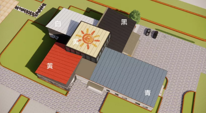 展览馆的展厅屋顶由彩色太阳能组件构成,根据社稷的造型分为东 西南北中,用五种颜色,青白红黑黄,寓意五谷丰登、国泰民安。