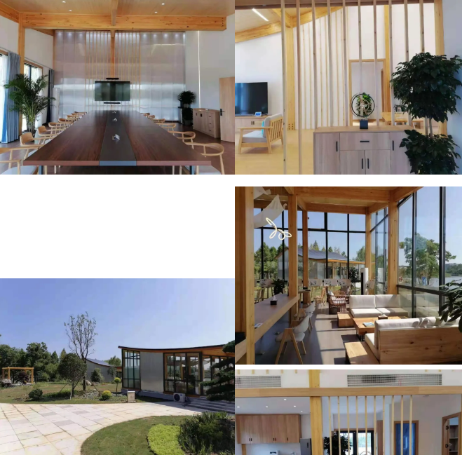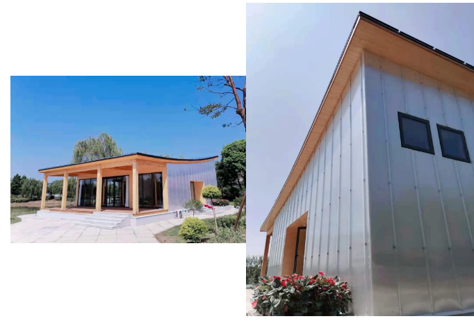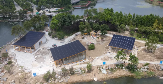 分别为“斋”“堂”“阁”“亭”,代表住宅、会议、咖啡厅等,实现家居、办公、休闲等场景示范。三座建筑总面积为480㎡、装机容量130KW、年发电15万度,预计能实现年减排二氧化碳120吨。