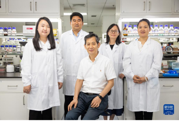 科研团队乔婧科研助理、蔡韬副研究员、马延和研究员、朱蕾蕾研究员、孙红兵科研助理(从左至右)在中国科学院天津工业生物技术研究所实验室合影(9月16日摄)。