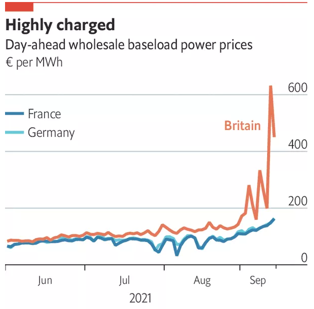 根据经济学家(Economist) 的报道欧洲的批发电价,在9月份狂飙突进。9月份,法国和德国的电价分别涨了36%和48%,达到了160欧元(189美元)的价格。更加离谱的是英国,批发电价在几周之内从147英镑直接涨到了385英镑(532美元)
