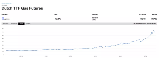 为什么欧洲的批发电价涨得如此厉害,因为原料上涨。天然气电厂是欧洲发电的主要来源之一。虽然目前可再生能源发电量占了欧洲发电量的38%,但很显然天然气为代表的化石燃料还是举足轻重的。今天欧洲的天然气价格,比3月份的时候高出四倍。