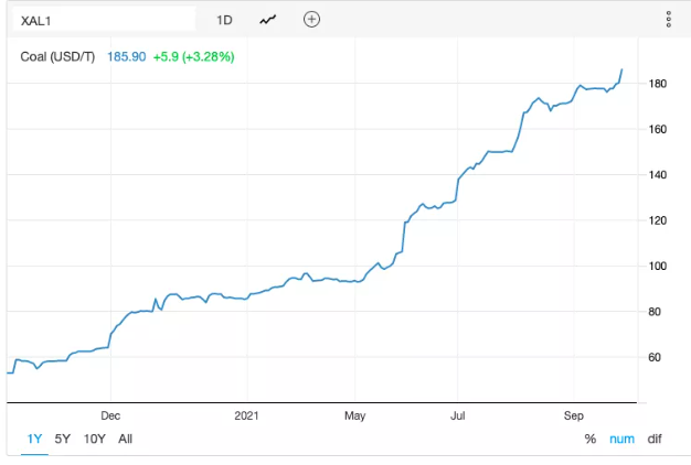 然而,国际市场方面,从2020年9月-2021年9月,美国期货市场的煤(XAL1)交易价格从50-55美元上涨到185-190美元,上涨幅度250%。