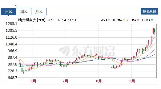 国内市场方面,郑商所动力煤期货(ZCM)2020年9月的550-600元,上涨到21年8月的800元左右,8月中开始暴涨,从800元拉升到9月23日的1200元以上,一个多月时间上涨50%。其中最近5个交易日上涨超过10%