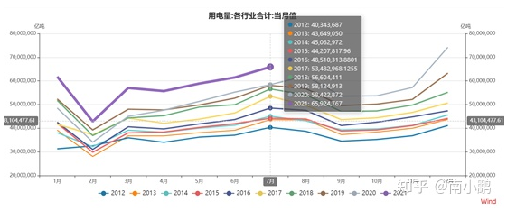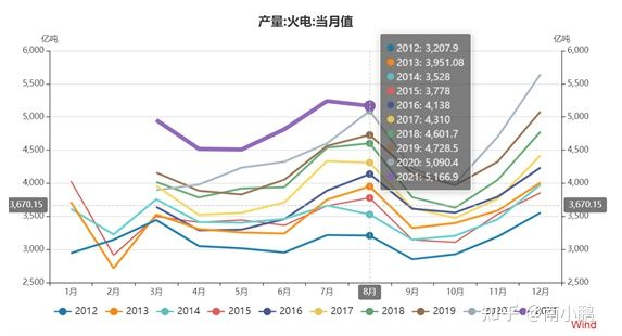 先从国内电力供需来看,中国火电产量(供给),今年(紫线)相比往年是增加的,今年增加的还比较显著。