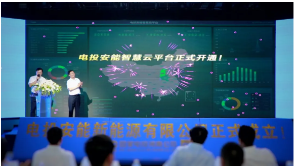 随后,梁华军按下平板电脑登录按钮,大屏显示的“电投安能智慧云平台”正式开通。未来,正泰安能将通过平台实现对3万多户电站的运行进行在线监控,以此有效保障电站的正常运行。