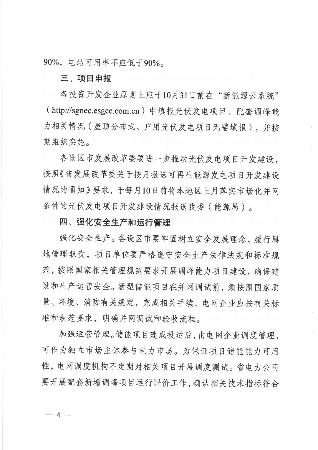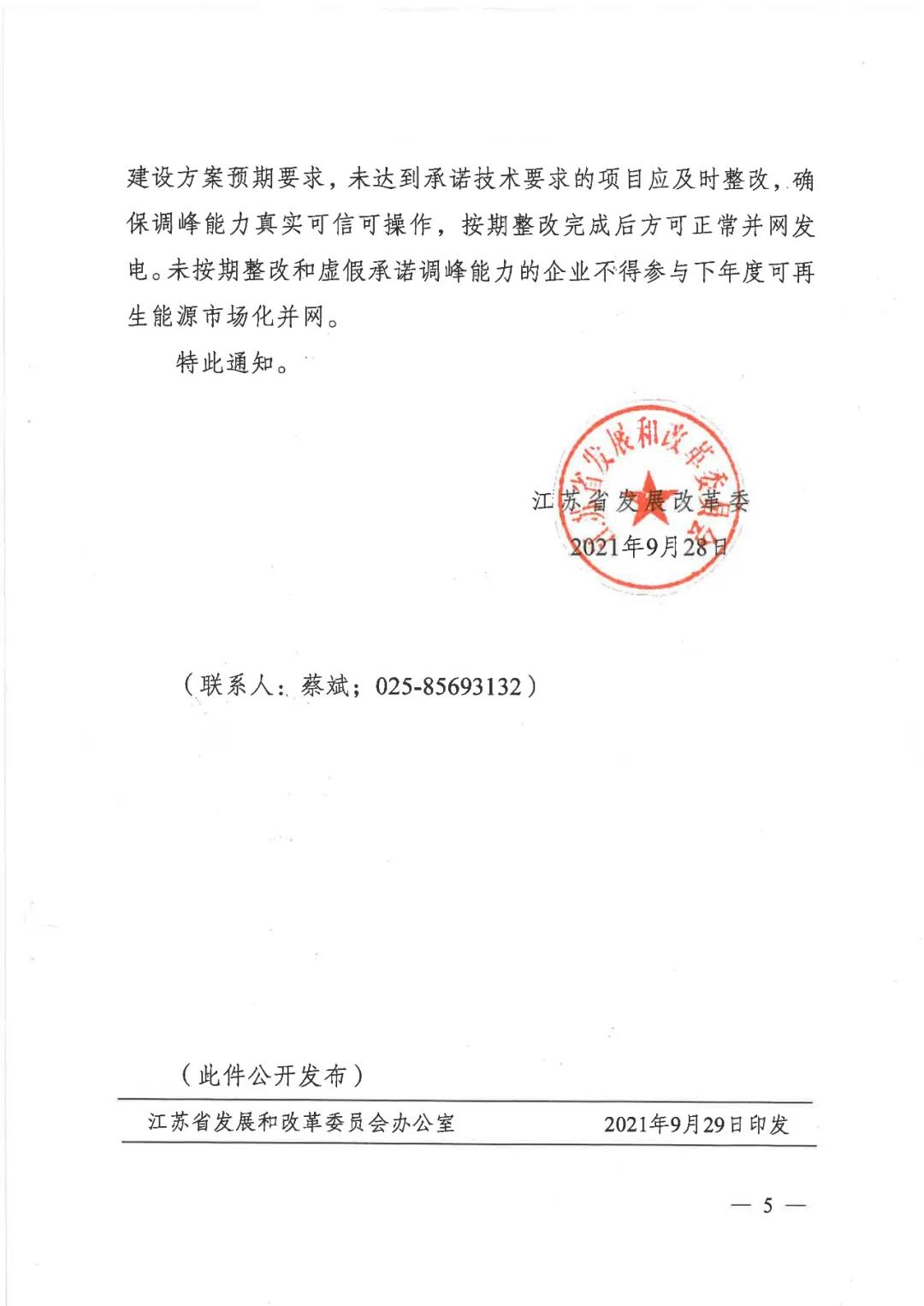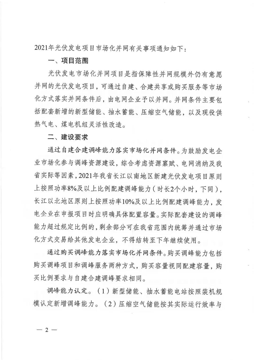 2021年江苏省长江以南地区新建光伏发电项目原则上按照功率8%及以上比例配建调峰能力(时长两个小时,下同);长江以北地区原则上按照功率10%及以上比例配建调峰能力,发电企业在申报项目时应明确具体配置容量。