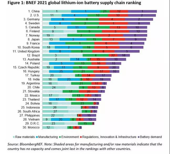 在这份调查报告中,欧洲国家是单独排名的,而不是将欧洲作为一个整体进行排名。事实上,如果将欧洲作为一个整体,那么在2021年调查中将排名第二,其电池产量仅次于中国,而欧洲的免关税贸易能力加强了行业参与者的地位。尽管如此,德国和瑞典这两个欧洲国家仍跻身2021年前五名。