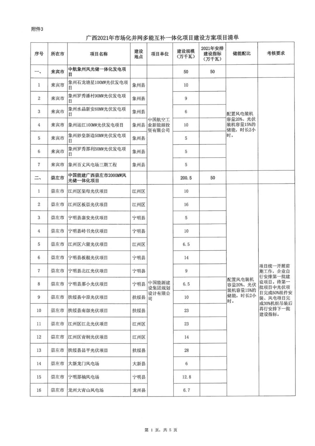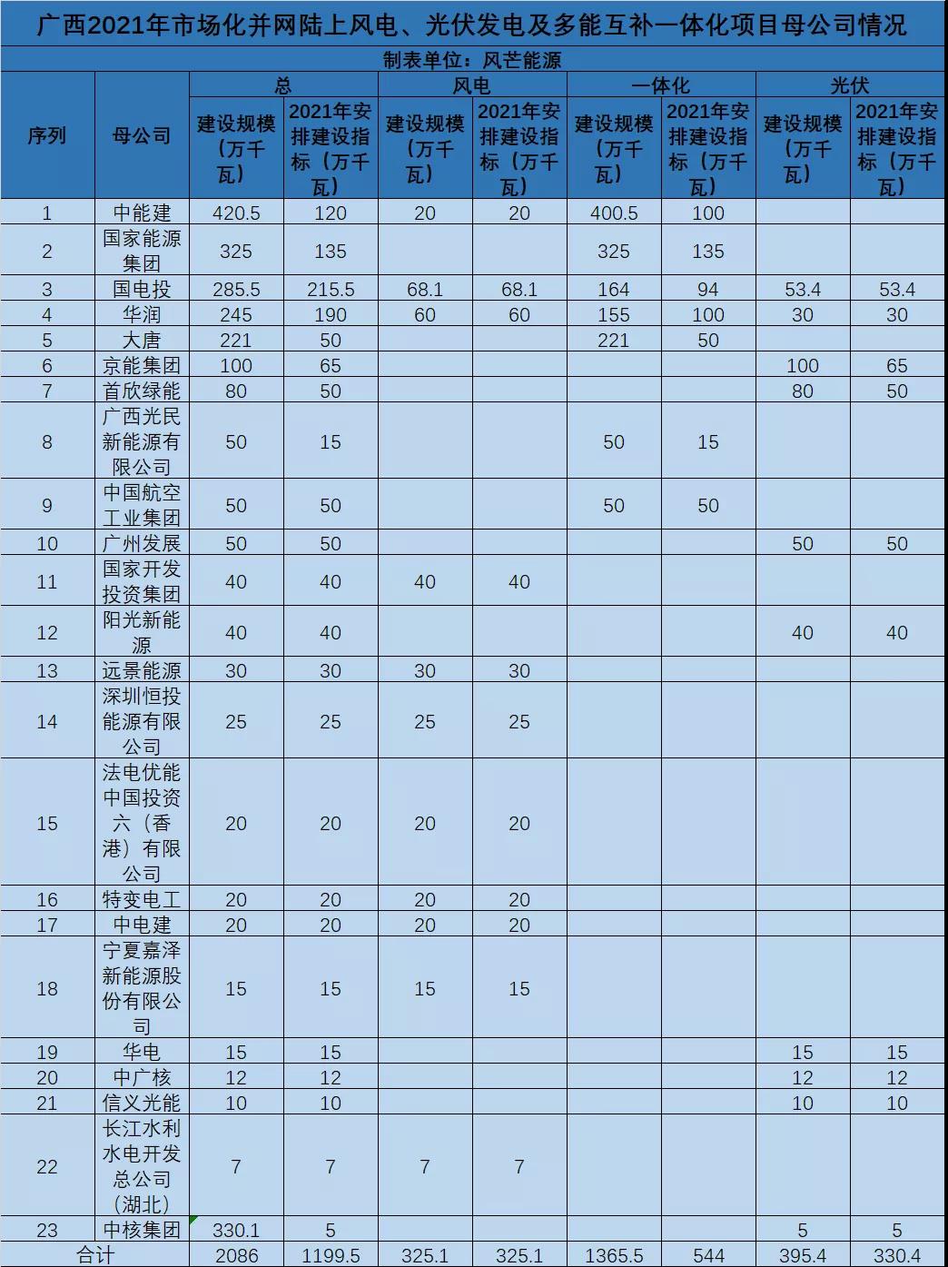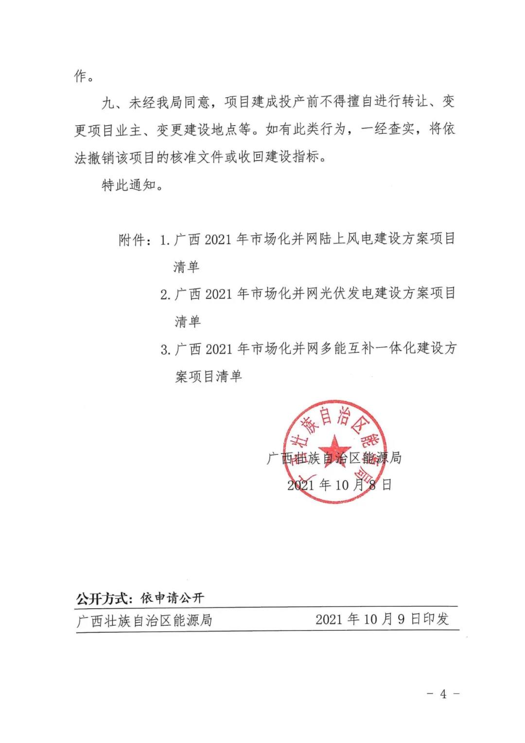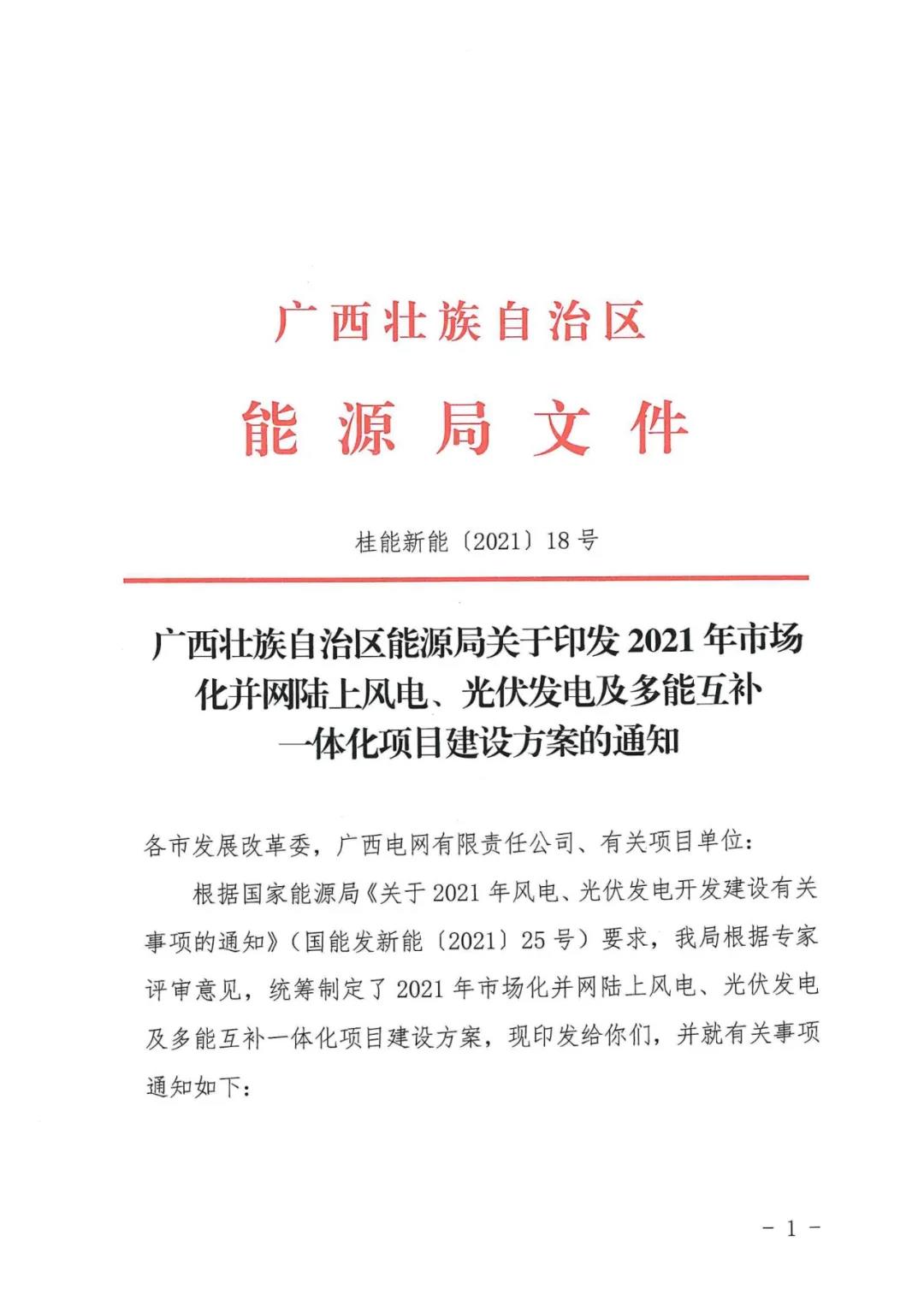 10月9日,广西壮族自治区能源局印发《2021年市场化并网陆上风电、光伏发电及多能互补一体化项目建设方案的通知》。
