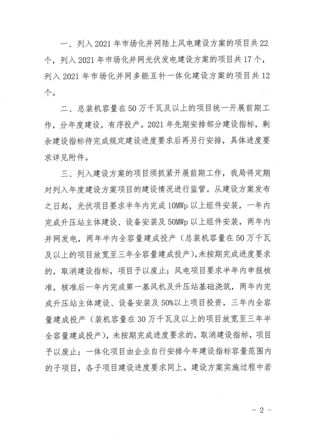 《通知》表示,总装机容量在50万千瓦及以上的项目统一开展前期工作,分年度建设,有序投产。2021年先期安排部分建设指标,剩余建设指标待完成规定建设进度要求后再另行安排。