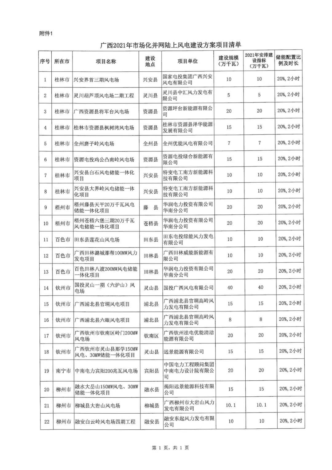 根据《通知》,列入2021年市场化并网陆上风电建设方案的项目共22个,总规模325.1万千瓦。2021年安排325.1万千瓦,配20%*2h储能;