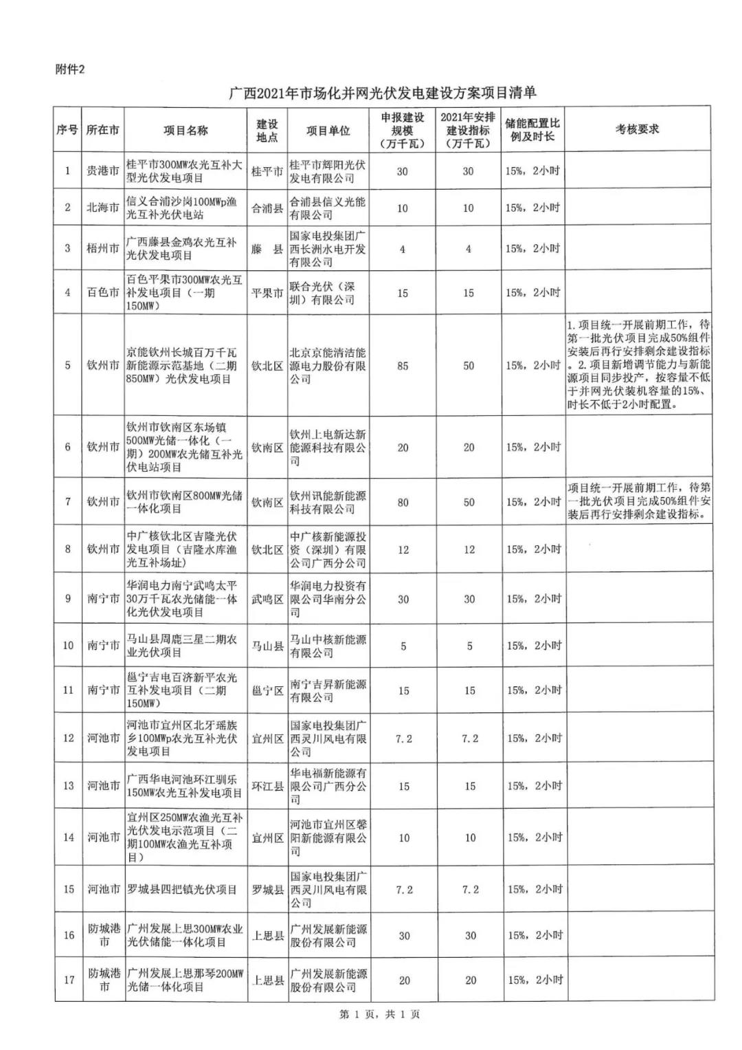 列入2021年市场化并网光伏发电建设方案的项目共17个,总规模395.4万千瓦,2021年安排330.4万千瓦,配15%*2h储能;