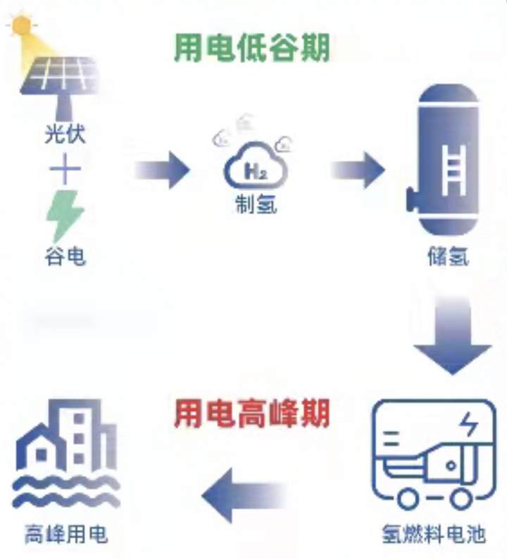 什么是氢电耦合?就是利用电网谷电、清洁能源制氢,将富余的电力转化为绿色氢能存储,在用电高峰时通过氢燃料电池发电实现电网削峰。在不影响园区正常生产用能需求同时,氢电耦合技术能够迅速实现用电负荷大幅下降。