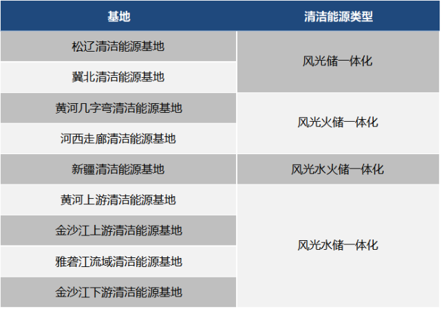 其中,松辽清洁能源基地和冀北清洁能源基地为“风光储一体化”基地;黄河几字弯清洁能源基地和河西走廊清洁能源基地为“风光火储一体化”基地;新疆清洁能源为“风光水火储一体化”基地;黄河上游清洁能源基地、金沙江上游清洁能源基地、雅砻江流域清洁能源基地、金沙江下游清洁能源基地为“风光水储一体化”基地。