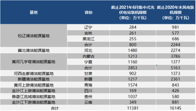 这九大清洁能源基地共囊括12个省份,截止2021年6月,这12个省份集中式光伏装机规模达11381万千瓦。截止2020年末,这12个省份风电装机规模达16145万千瓦。