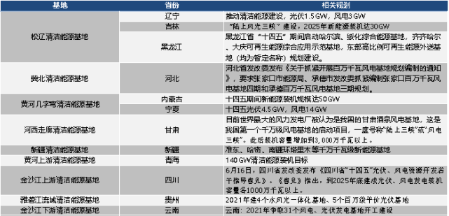在2021年3月公布的“十四五”规划中,大型风电光伏基地概念已有体现,“十四五”规划在东北、华北、西北、西南等地区规划了九大清洁能源基地,九大清洁能源基地共囊括12个省份,目前已经建成超万亿千瓦的光伏、风电装机规模。