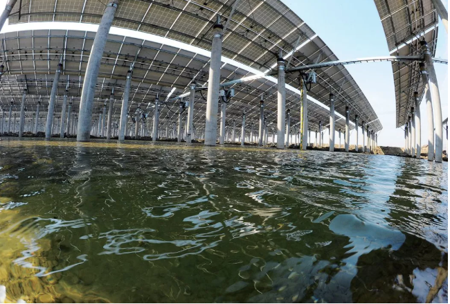 利用鱼塘广阔的面积,在上面安装太阳能电池板来发电,光伏组件立体布置于水面上方,下面水产养殖,一地俩用,利润比单纯水产养殖大幅提高。