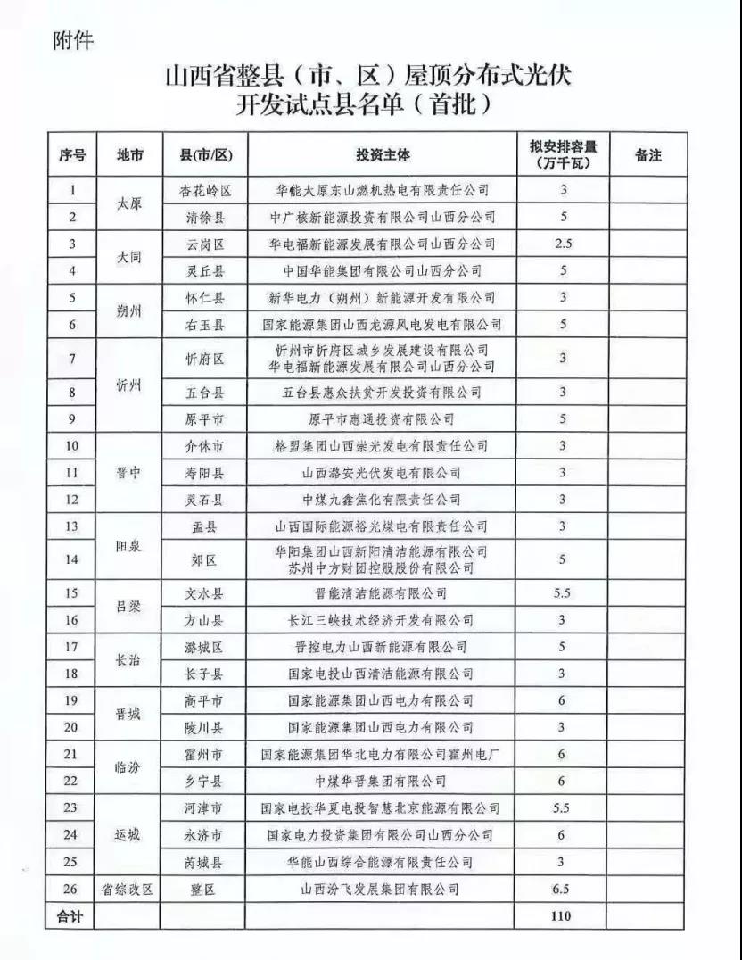 山西省首批光伏整县推进名单共涉及26个县(市、区),规模总计为1.1GW,且所有试点县均明确了项目投资主体,全部为国有企业。从规模来看,山西整县推进试点项目主要集中在30~50MW,个别较高的县达到了65MW。