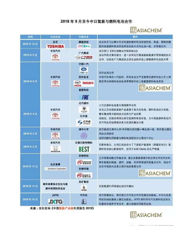 亚化咨询研究表明,这已不是中日第一次在氢能与燃料电池上合作了。2018年9月至今,中日氢能与燃料电池领域的合作如下所示: